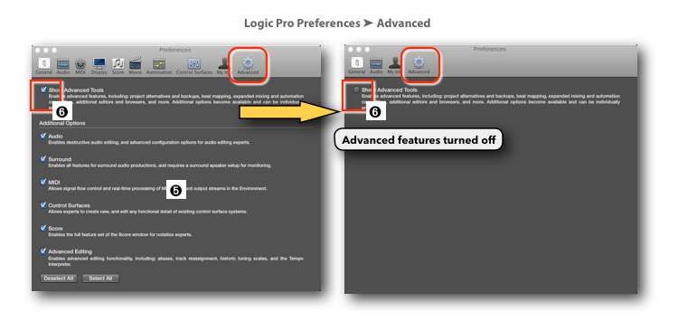 In the Logic Pro Preferences ➤ Advanced page, you can disable specific advanced features ➎ so you are not overwhelmed at first.