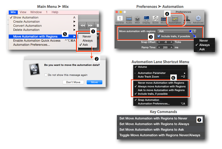 - ➎ Main Menu Mix ➤ Move Automation with Regions ➤