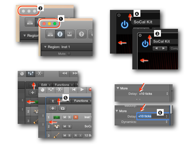 - Region Inspector Float ➌: The Region Inspector is part of the Main Inspector in Logic’s Main Window. If you are editing and need constant access/visibility of that window, then you don’t want it to be hidden by another window. You can use the Menu Command or Key Command to open the Region Inspector as a floating window (called “Region Inspector Float”). As a little trick, you can drag the Header of the Region Inspector away from the Main Inspector to “tear it off” as a separate “Region Inspector Float”