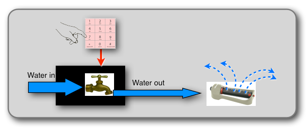 To upgrade your sprinkler system, you go to your local hardware store and buy yourself a programmable unit. The water is still controlled by a valve, but you don''t touch the valve directly anymore, it is hooked up to your programmable unit. Now, you have a controller (i.e. a keypad) that just sends a control signal to the unit, which sets the amount, how much to open the valve, for example, a range from 0 to 10.