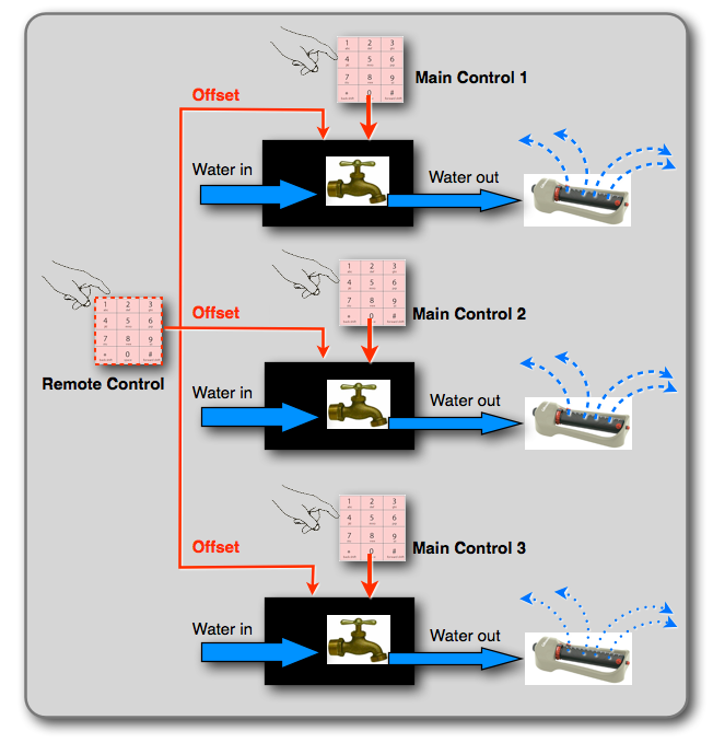 Think about the following situation. Your two neighbors, who happen to have the same type of sprinkler system, are going on a vacation. They configure their units, so they can receive a control signal (an offset value) from your Remote Control. For example, Bob might have a bigger garden and sets his water flow higher). Now if it was raining a few days ago, you can use your remote control to reduce the water flow on all three systems at the same time, sending the same offset value. If you send a value of -2, then all three sprinkler units lower their setting by 2. If Bob''s system was set to 8, it would now be 6, and if your setting was at 5, it would now be at 3.