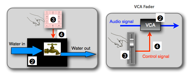 Now here is the important part. The VCA component on each Channel Strip (the element in the audio signal flow that sets the audio level) can receive two control signals. One control signal is coming from its own Fader ➐ on the same Channel Strip, and a second control signal ➑ can come from a VCA Master Fader ➒ sending an offset value. The actual result (how much the VCA on a Channel Strip changes the signal level) is the sum of both control signals (the main control signal from the Channel Fader, plus the offset control signal from the VCA Master Fader). All the Channel Strips that receive their additional control signal from the same VCA Master Channel "belong to that VCA Group". In our sprinkler system analogy, your sprinkler and your two neighbor''s sprinkler were assigned to the same "VCA Group", meaning they were controlled by the same Remote Control keypad in your living room (the same VCA Master Fader).