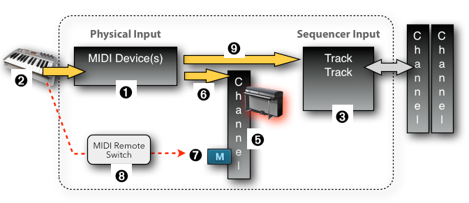 - Keep in mind that the MIDI Signal from the Physical Input is still going parallel ➒ (at the same time) to the Sequencer Input to the selected Track(s) ➌ in your Tracks Window.