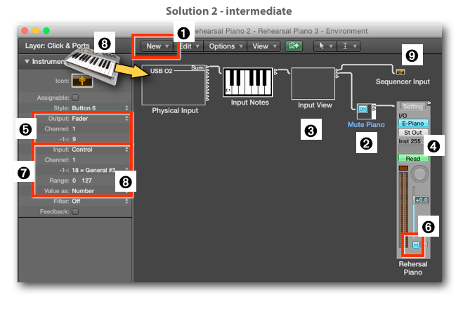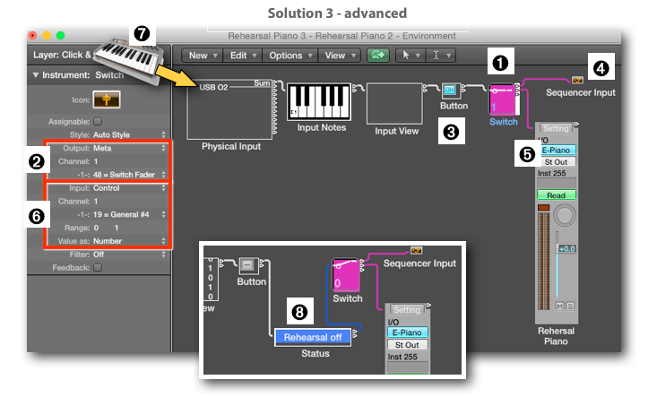 - You use the Mute Button ➐ on that Channel Strip to turn your Rehearsal Piano on/off. As an advanced setup, you can create a remote switch ➑ in the Environment that lets you control the Mute Button ➐ from your MIDI Keyboard ➋.