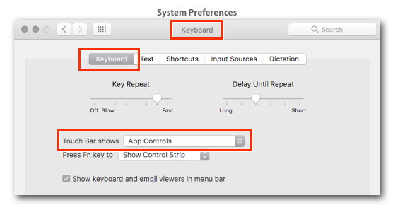 - From the "Touch Bar shows" popup menu, select "App Controls". This utilizes the entire strip to show only the controls provided by the app that has currently key focus.