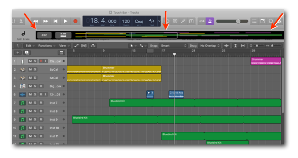If you select the Timeline Overview for the Touch Bar and place the Touché window over the Toolbar in Logic's Main Window, you can simulate a Pro Tools feature that many Logic users would like to have implemented in Logic, a Timeline Overview of your entire Project.