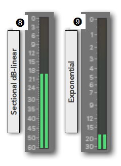 - Scale: The "Sectional dB-linear" ➑ option is selected by default, but if you need a higher resolution in the upper meter range, you can choose the "Exponential" ➒ option. The screenshot on the right shows the same -20dB level displayed on the two scales.