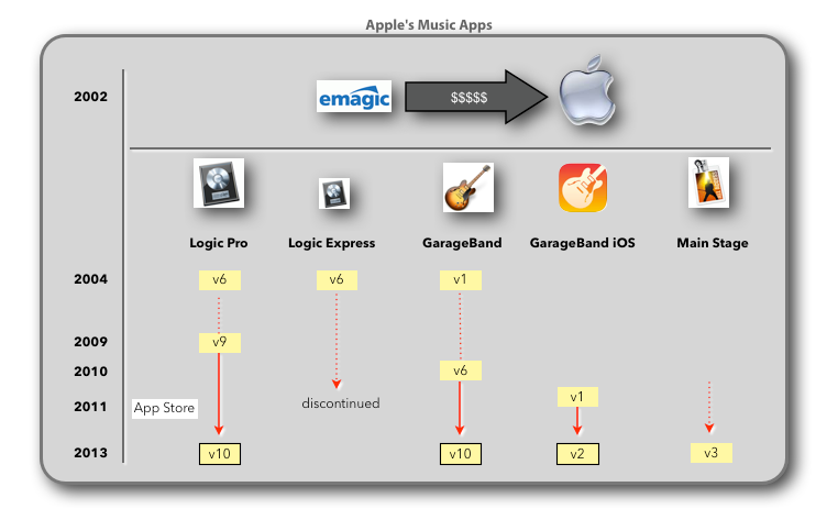 - In 2002, Apple bought the German software company Emagic and it seemed that they were interested in their popular audio application “Logic”. Although this might be true, it became apparent that Apple also might had plans to get Emagic’s engineers and their know-how to build Apple’s entry level music app “GarageBand” which was released as v1 in 2004 together with Logic Pro v6 and a lighter version of Logic Pro called “Logic Express”.