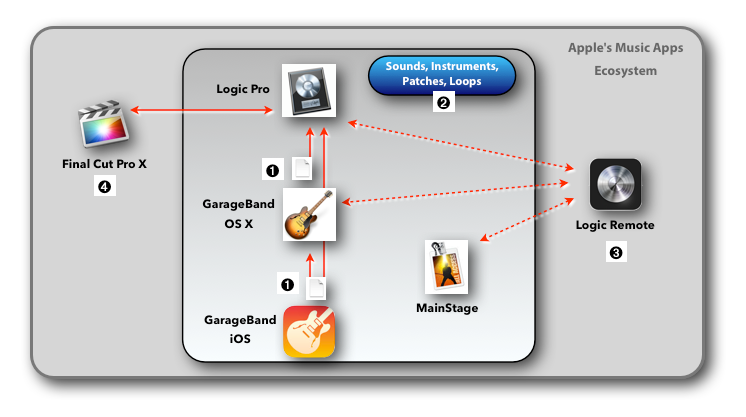 ➋ All the apps share the same pool of Sounds, Instruments, Patches and Apple Loops.
