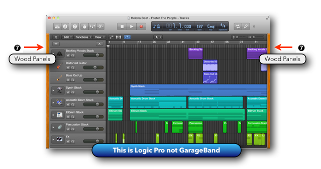 To make GarageBand users feel even more at home, the developers at Apple added a sweet little touch. If you disable the “Show Advanced Tools” checkbox ➏ (all the Advanced features are now turned off), then Logic Pro X will add GarageBand’s wooden side panels ➐ to the Logic Main Window.