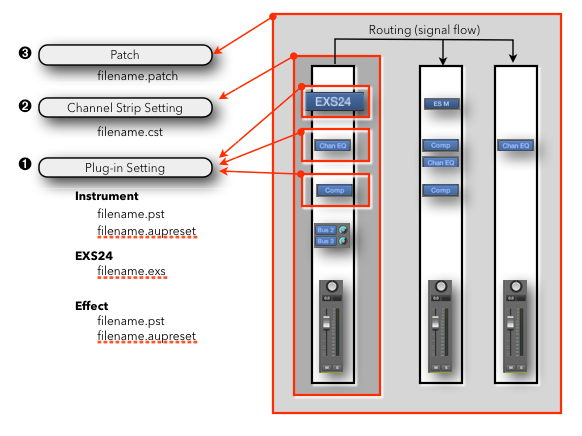 - ➌ Patches: A Patch is a new setting introduced in Logic Pro X. It represents the top level of the hierarchy. This set can contain the configuration of a single Channel Strip Setting plus all the Channel Strips that are part of its “signal flow”. That means, all the Aux Channels that the Channel Strip is routing its signal to, via its Aux Sends. Of course, all the Plugins of those Aux Channel Strips are also included. This is a very powerful Settings File that lets you create, save, and later load very complex setups and configurations.