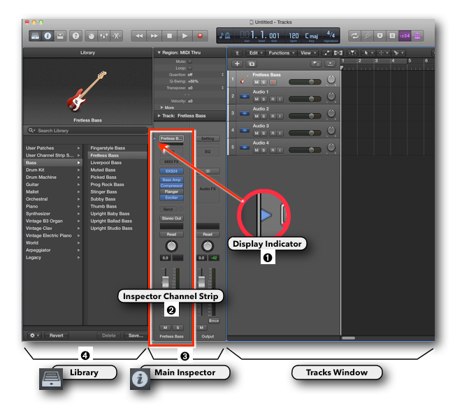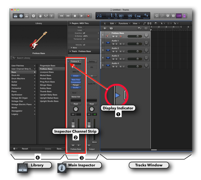 - Some Channel Strip Types don’t display the blue Display Indicator (i.e. the External MIDI Channel Strip), but they still display items in the Library Window. These can be objects like MIDI Devices or Rewire Channels.