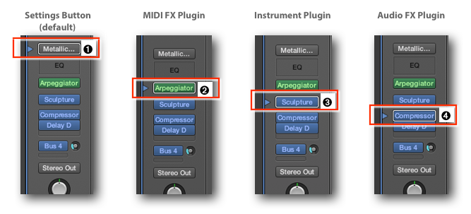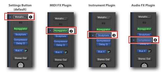 Let’s look at the following four types of buttons/slots on the Channel Strip. You click to the left of any of those buttons to move the Display Indicator there. By positioning the Display Indicator next to a specific button, you tell the Library what to display, and the Library Window will show only those settings that are relevant. It is like asking the friendly librarian that you are looking for science-fiction books and she/he sends you to that specific aisle.