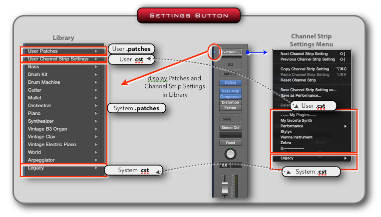 - Because, when selecting the Settings Button, the Library Window displays Patches and Channel Strip Settings, make sure that you know which item is which.