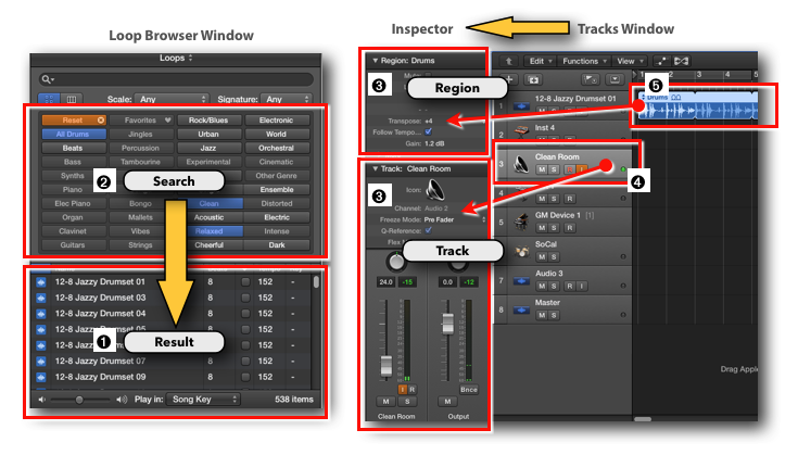 - A browser window displays a specific content (the search result ➊) based on a specific search criteria (the search query ➋). Therefore, if the search criteria changes, the content changes accordingly. For example, the Loop Browser displays only the Apple Loops that match the search criteria that you entered.