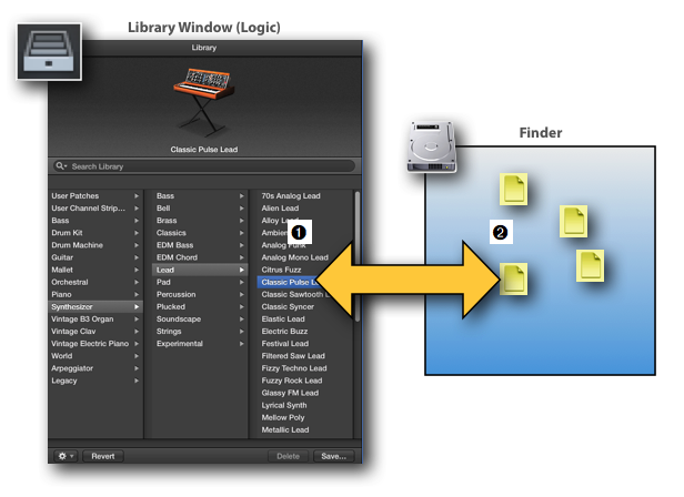 - Files: What you see in the Library Window ➊ are the representation of actual files that exist on your hard drive ➋. The Library Window is just a browser, like a special Finder Window that displays those files.