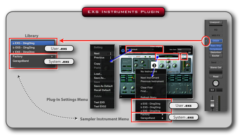 - ➌ Instrument Plugin Button: The Library Window displays all the available Plugin Settings for the currently selected Instrument Plugin in that slot. Please note that, when an EXS 24 Instrument is selected, the Library will display the EXS24 Instrument files (.exs) and not the EXS24 Plugin Settings!