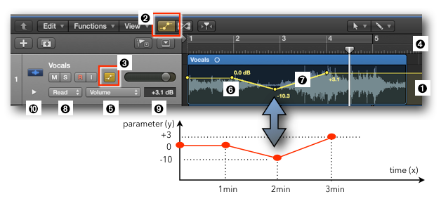 - ➏ Control Points: The red dots on the math graph represent the values of the parameter at a specific time. In math class, these were called the “coordinates”, but Logic Pro calls them “Control Points” or “Automation Points” (other applications use the terms “Nodes” or ‘Keyframes”). These Automation Control Points define the Automation Curve.