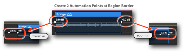 - Create 1 [or 2] Automation Point at Region Borders (left border of first and right border of last selected Regions)
