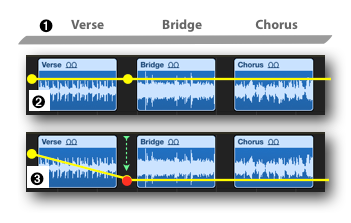 The following example demonstrates a Guitar Track that has three Regions. These three Regions represent three parts of your song, the Verse, the Bridge, and the Chorus ➊. Let’s assume you want to lower the volume during the Bridge part by manually creating an Automation Curve.