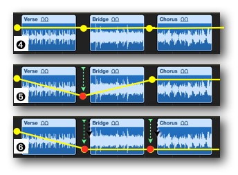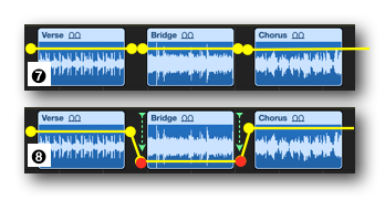 - ➑ Lowering the Control Point of each pair that is on the “inside” of the Bridge (or lowering the line between those two Control Points, now only lowers the level for the Bridge. As you can see, the other Control Points of the pair next to them guarantee that the Automation Curve before and after the Bridge is not affected.