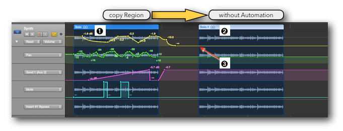 I copied the Region ➊ on the left and as you can see, the automation data is not affected. However, this could be problematic. For example, if the original Region had a fade out at the end, then you wouldn’t hear the copied Region ➋ because the Volume is still down ➌. That’s one of the reasons to move the automation data with the Region. However, let’s look at the next example to see what else could happen.