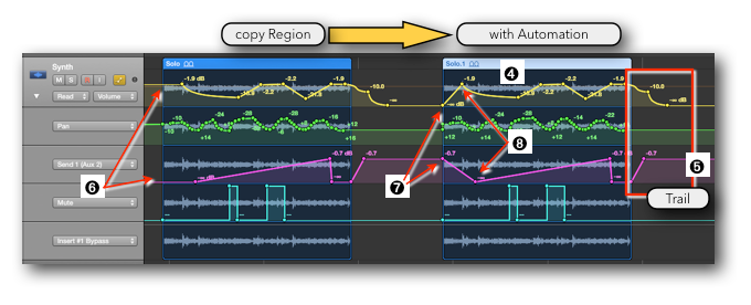 This screenshot shows you the copied Region with automation data ➍. You also can see the effect when the “Include trails, if possible” option is activated. The additional automation data after the right border of the original Region is also added at the end of the copied Region ➎.
