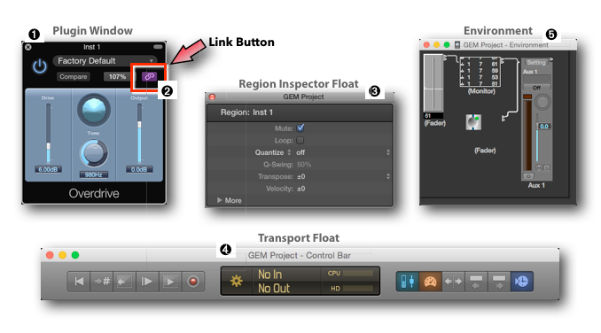 - Region Inspector Float ➌: The Region Inspector is part of the Main Inspector in Logic’s Main Window. If you are editing and need constant access/visibility of that window, then you don’t want it to be hidden by another window. You can use the Menu Command or Key Command to open the Region Inspector as a floating window (called “Region Inspector Float”). As a little trick, you can drag the Header of the Region Inspector away from the Main Inspector to “tear it off” as a separate “Region Inspector Float”