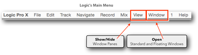 Please Note: Logic’s Window Menu lists the commands that let you open Standard Windows and the View Menu lists mainly the commands to Show/Hide the various Window Panes in Logic’s Main Window.