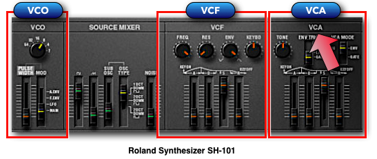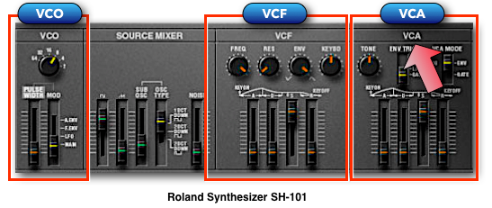 If you ever worked with an analog synthesizer (based on subtractive synthesis), then you might be familiar with the knob that is labeled "VCA". There are usually three types of those terms, VCO - VCF - VCA, where "VC" stands for "voltage controlled" and the last letter represents the Oscillator, Filter, and Amplifier. These are the three main components of a traditional analog synth.