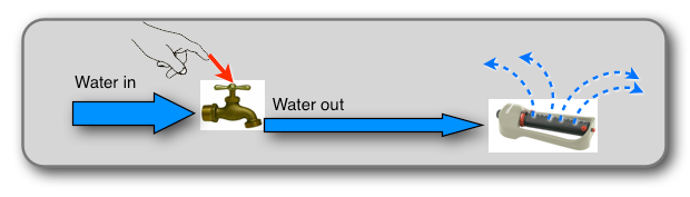 Assume you have a water hose in your garden attached to a valve with a knob or a handle that lets you control the amount of water running through the hose to your sprinkler system. The important part is that the water itself flows through the "unit", the component you are using to control the water flow, the valve.