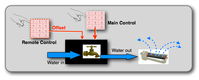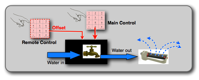 Think about the following situation. Your two neighbors, who happen to have the same type of sprinkler system, are going on a vacation. They configure their units, so they can receive a control signal (an offset value) from your Remote Control. For example, Bob might have a bigger garden and sets his water flow higher). Now if it was raining a few days ago, you can use your remote control to reduce the water flow on all three systems at the same time, sending the same offset value. If you send a value of -2, then all three sprinkler units lower their setting by 2. If Bob''s system was set to 8, it would now be 6, and if your setting was at 5, it would now be at 3.