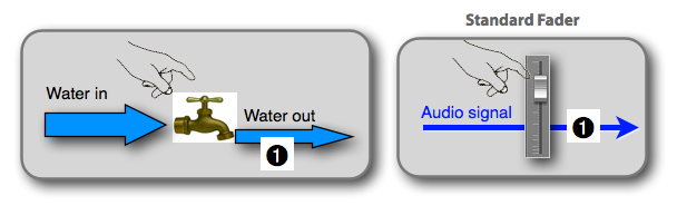 A Standard Fader on an analog mixing console functions like that single valve. The audio signal runs through the Fader ➊ and by moving the Fader up or down, you affect how much of the audio signal goes through, and therefore, determining the audio level.