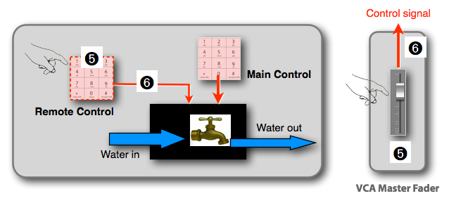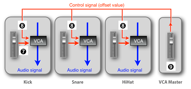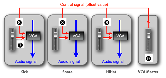 Now here is the important part. The VCA component on each Channel Strip (the element in the audio signal flow that sets the audio level) can receive two control signals. One control signal is coming from its own Fader ➐ on the same Channel Strip, and a second control signal ➑ can come from a VCA Master Fader ➒ sending an offset value. The actual result (how much the VCA on a Channel Strip changes the signal level) is the sum of both control signals (the main control signal from the Channel Fader, plus the offset control signal from the VCA Master Fader). All the Channel Strips that receive their additional control signal from the same VCA Master Channel "belong to that VCA Group". In our sprinkler system analogy, your sprinkler and your two neighbor''s sprinkler were assigned to the same "VCA Group", meaning they were controlled by the same Remote Control keypad in your living room (the same VCA Master Fader).