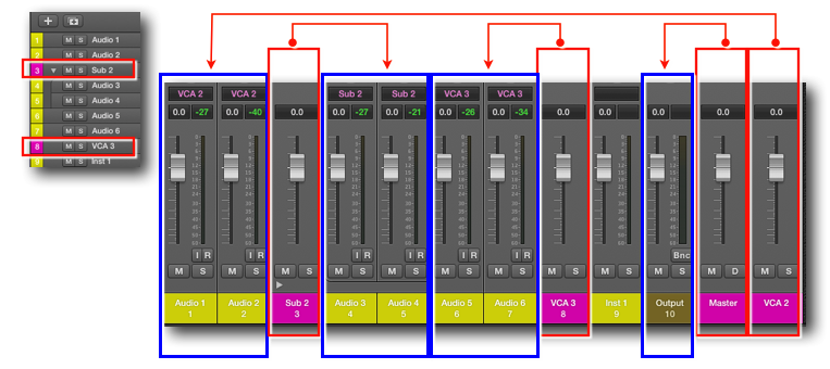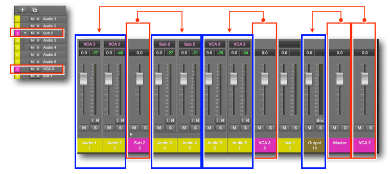 After all that, it will be easy to decipher a mixed VCA/SummingStack/Master routing setup like in the following screenshot.