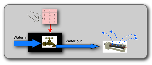 To upgrade your sprinkler system, you go to your local hardware store and buy yourself a programmable unit. The water is still controlled by a valve, but you don''t touch the valve directly anymore, it is hooked up to your programmable unit. Now, you have a controller (i.e. a keypad) that just sends a control signal to the unit, which sets the amount, how much to open the valve, for example, a range from 0 to 10.