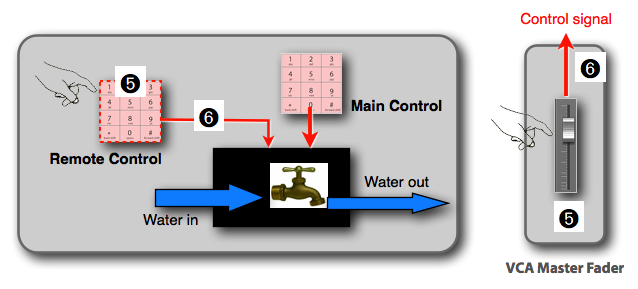 So the Fader on each Channel Strip is technically a VCA Fader that sends its control signal to the VCA component on that Channel Strip to set the audio level. This represents the Main Control, the keypad on the sprinkler system unit. Now in addition to those VCA Faders (Main Controls), there are the so-called "VCA Master Faders", similar to the Remote Control of your sprinkler system in your living room. These VCA Master Faders are Channel Strips that contain only a VCA Fader ➎ that sends out a control signal ➏, an offset signal. There is no audio signal running through such a Channel Strip (VCA Channel Strip). It is a Channel Strip with just a Fader (plus Mute and Solo).