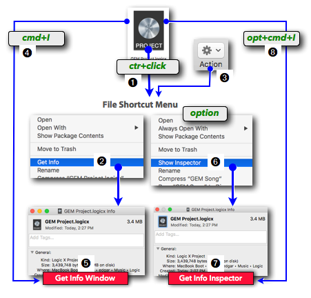 Holding down the option key when the Shortcut Menu is open will change the menu item from "Get Info" to "Show Inspector" ➏. This command will open the same window, but now as an Inspector ➐ type window. Alternatively, you can use the Key Command opt+cmd+I ➑ on a selected file/folder.