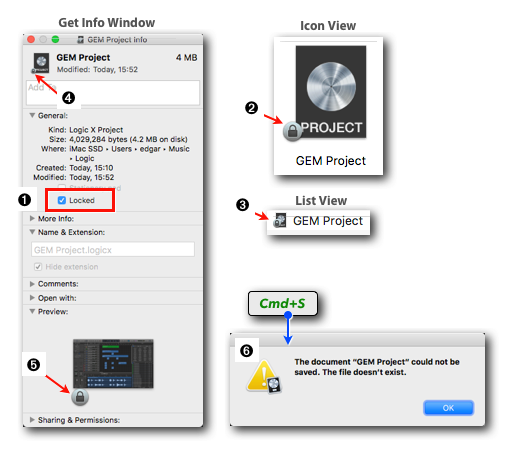 - A locked file will display a padlock in multiple places: In the Finder (better visible in Icon View ➋ than List View ➌), in the Get Info Window on the file icon ➍ (in the upper-left corner) and on the Preview Image ➎.