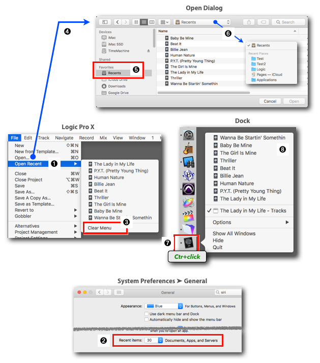 - And there is even another location that displays the Recent list, the Dock. Ctr+click on the Logic icon ➐ in the Dock and the popover shows you a list with the recent Projects ➑. The advantage with the Recent list in the Dock is that you don''t have to have Logic open yet. You can launch Logic directly into a specific Project from that Recent list.