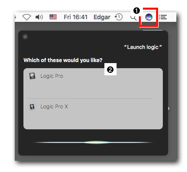 Just click on the Siri Icon ➊ in the upper-right corner of your computer screen (or setup your own Key Command in the System Preferences ➤ Siri) and say "Launch Logic". If you have Logic Pro 9 and Logic Pro X installed on your computer, she even recognizes that and asks you which one she should launch ➋.