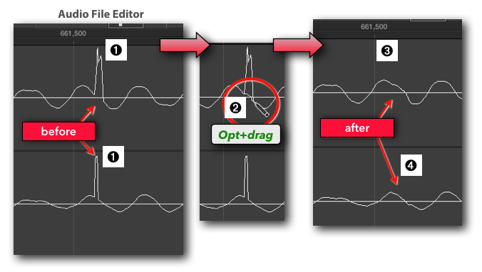- Tip 1: If you work on a stereo audio file, you don''t have to perform the drawing twice if the click appears on both channels, just hold down the option key ➋ and whatever you draw on one channel ➌ will be applied to the other channel ➍.