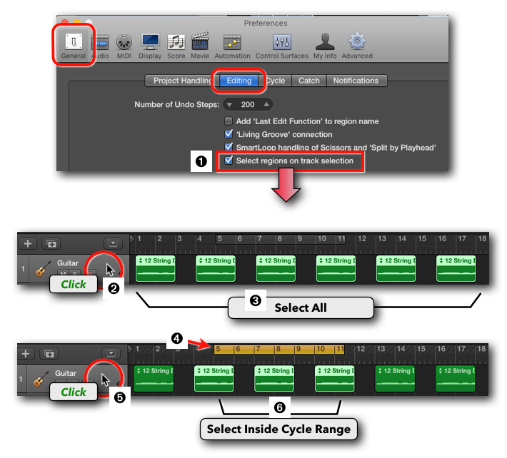 And here is a variation of that functionality. When you enable the Cycle Range (Key Command C or just click on it), it turns yellow ➍, and now, when you click on a Track Header ➎, then only the Regions (or portion of the Regions) on that Track Lane that fall inside the left and right locator of the Cycle Range will be selected ➏.