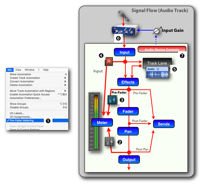 If the "Pre-Fader Metering" ➊ option is enabled, then the Meters show the signal before ➌ the Volume Fader (after the Audio Effects).