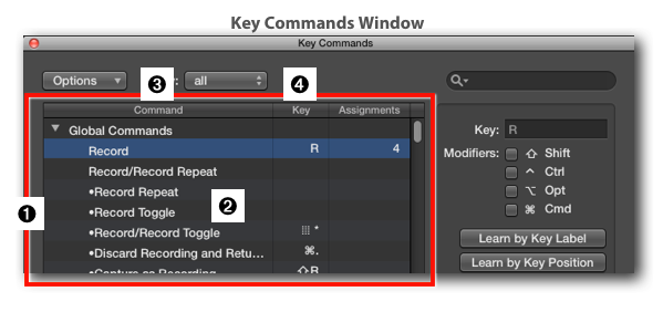 A Key Command has two elements. The "Command" ➋ is the description of what happens when you use the command, which is listed in the Command column ➌ of the Key Commands Window. In order to use a Key Command, it has to have a key or key combination on your computer keyboard assigned to it (Control Surface triggering is a different topic). The assigned key(s) is also referred to as a "Key Combination" or "Key Equivalent", which is listed in the Key column ➍ of the Key Commands Window.