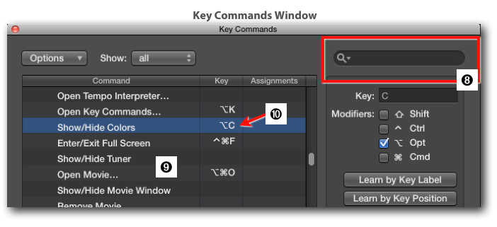 - Click inside the Key Commands List ➒. This will make sure that the Search Field doesn''t have key focus anymore (no blue frame ➑), and instead, moving the key focus to the Key Commands List. When you click on it, you select a line that turns blue.