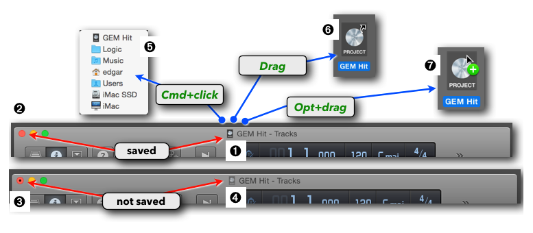 - File Path: Cmd+click on the Proxy Icon to open a menu displaying the File Path ➎ where this Logic Project File is stored. Select any folder on that menu to open that Finder Window.