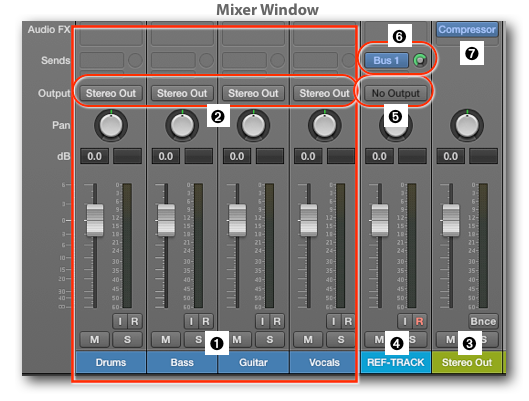 - Compressor Off: If you bypass the Compressor (deselect its Power Button), then you will hear your regular mix ➍ on the Output Channel Strip with all the Channel Strips that are routed to the Output Channel Strip ➎.