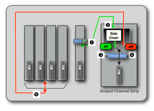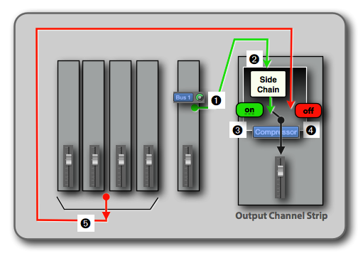 - Compressor On: You configure the Compressor (one button that I show in the next section) so the Compressor passes the Side Chain signal (Bus 1 = Reference Track signal) through to its output ➌. That means, you only will hear the Reference Track on the Output Channel Strip.