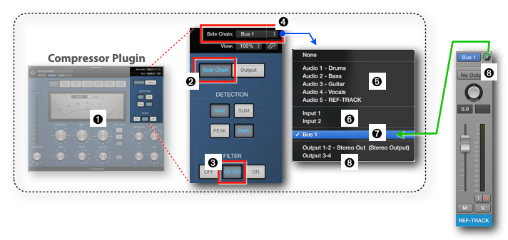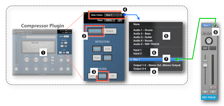 - Select Side Chain: In the Compressor Plugin, you select the Bus 1 that you send from the Reference Channel Strip ➊ as the source for the Compressor''s Side Chain Input ➋.